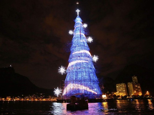 Brasileños reman alrededor del árbol de Navidad flotante más grande del mundo en Río de Janeiro, Brasil. El árbol mide 85 metros de altura y cuenta con más de 3 millones de bombillas.