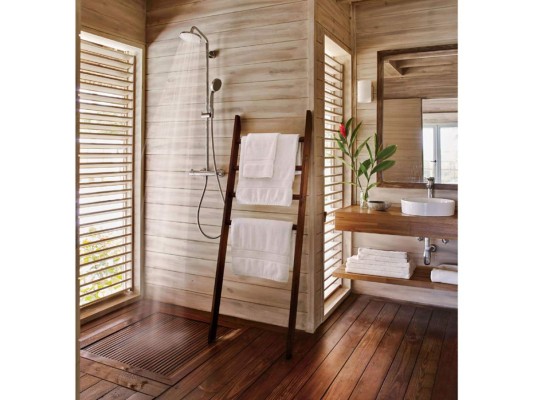 2 / 17Uno de los baños de invitados, diseñado en pino americano y equipado con grifería Hansgrobe -