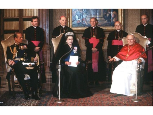 27 / 38Los esposos junto al Papa Juan Pablo II en 1980. Isabel se convirtió en la primera monarca en visitar el Vaticano, fortaleciendo los lazos entre la Iglesia Católica y la Iglesia de Inglaterra. -