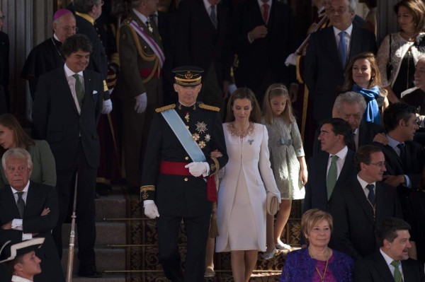 La nueva Princesa de Asturias, Leonor de Borbón y su hermana la Infanta Sofia, presenciaban el primer acto de la proclamación de su padre, Felipe VI vestidas con dos trajes iguales cada una en un color diferente. La nueva Princesa en tonos rosas y su hermana pequeña en tonos azules. Ambas llevaban unas bailarinas.