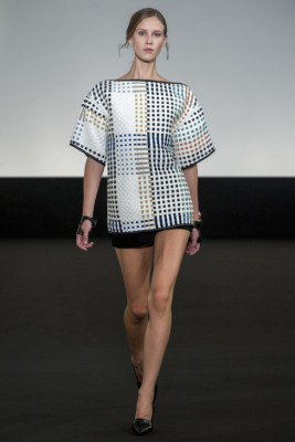 El cuero ha sido uno de los materiales estrella de la colección junto a otra de sus piezas clave: la corbata. En tono marrón, esta prenda se ajustaba al cuello de las modelos masculinizando sus outfits y aportando seriedad a un desfile en el que hemos encontrado multitud de colores como el azul klein, negro, morado y crema.