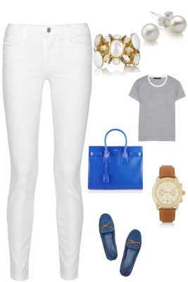 White pants and electric blue accents